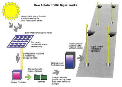 A Solar Powered Traffic Signal Systems are the traffic signals powered by solar consisting of cantilever and primary poles, signal heads, signal aspects, pedestrian aspects, count down timer, solar penal, controller (solar/grid charger: grid controller), battery charged by SPV panels/grid connection.